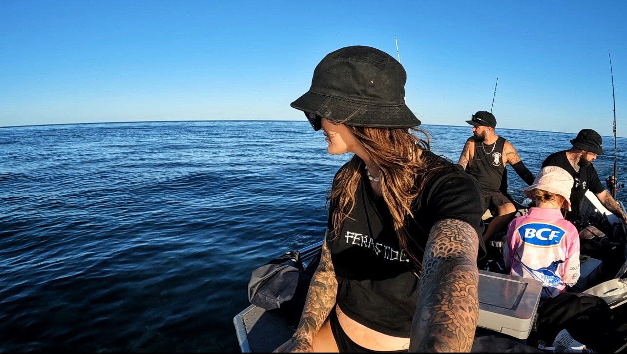 100% combed cotton (heathers 15% viscose) - Ferals Tide print front and centre of tee